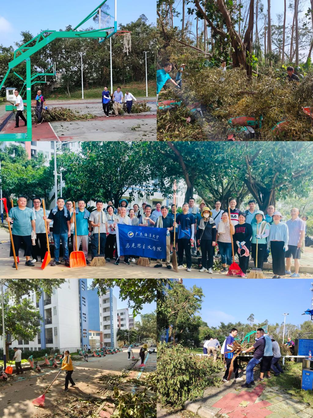 2025年第21号台风“麦德姆”于10月5日在湛江徐闻县沿海登陆。14级台风肆虐,学校校园环境和基础设施遭受重创,众多树木断倒,道路阻塞,满目疮痍。马克思主义学院30名教职工积极响应学校党委号召,在学院党委陈青松书记、曹望华院长带领下于10月8日上午到湖光校区投身于灾后清理重建工作。