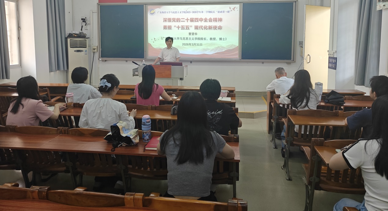 为深入学习贯彻党的二十届四中全会精神和2026年全国两会精神,准确把握国家“十五五”规划的战略前瞻与时代方位,3月31日下午,马克思主义学院以“深学细悟谋发展 挺膺担当启新程”为主题,组织开展2026年春季学期院长“思政第一课”。学院院长曹望华教授为2025级马克思主义理论专业研究生讲授一堂兼具理论高度、思想深度与实践温度的“大思政课”。